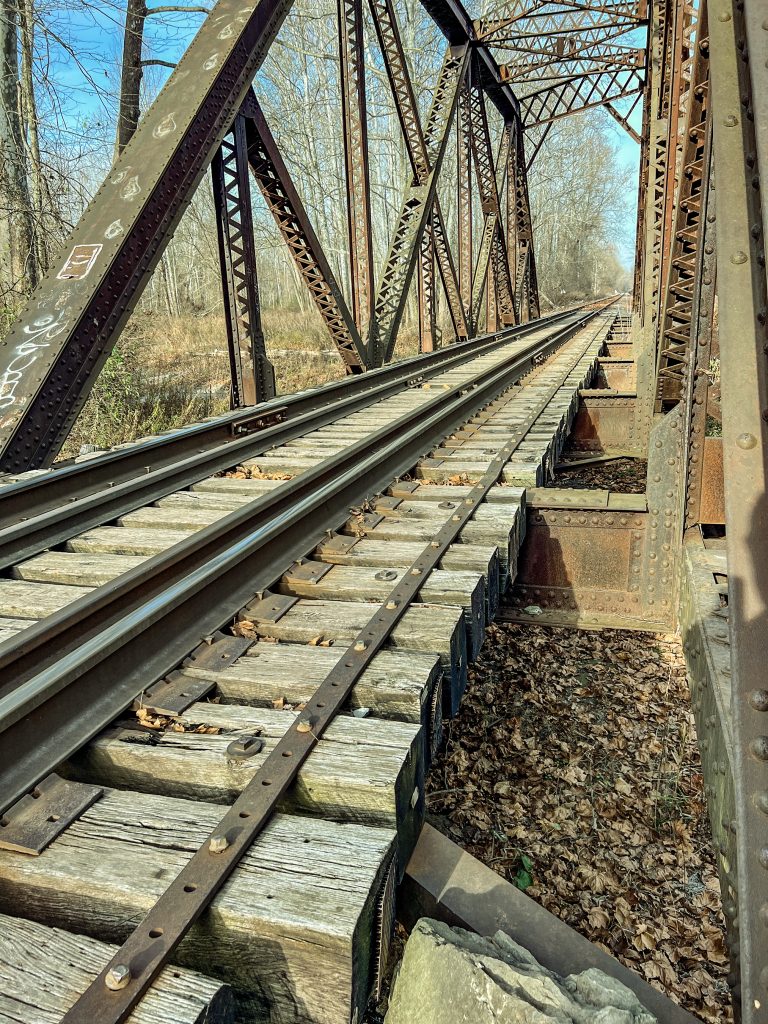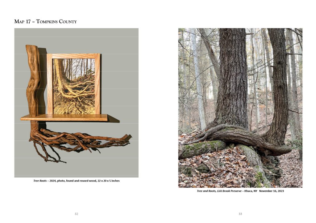 In 2017, I did not have the slightest inkling about creating a series of sculptures about the trail. So in 2023, when I realized that I had very few photos from Map 17, I asked my friend, Susan Larkin, to hike part of that map with me again. We set out together on a crisp, sunny November morning. I thought this train bridge would be the answer. Then we continued up the hill toward Lick Brook Preserve. I captured some images of a tree with its roots exposed by erosion. One of those photos inspired the sculpture shown on page 32.
